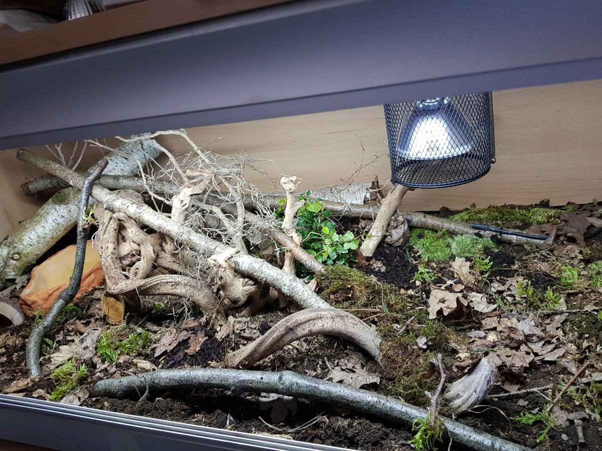 Then it was a case of adding and arranging the branches, not only allow exercise and physical enrichment. But the feeling of safety, and coverage from the heat and UVB for the Snake.